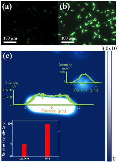 - Park, D.H.; Kim, N.; Cui, C.; Hong, Y.K.; Kim, M.S.; Yang, D.-H.; Kim, D.-C.; Lee, H.; Kim, J.; Ahn, D.J.; et al. DNA detection using a light-emitting polymer single nanowire. Chem. Commun. 2011, 47, 7944–7946. [Google Scholar] [CrossRef] [PubMed]