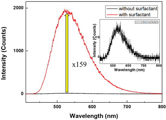 Sample preparation: Alq3 (C27H18AlN3O3, purity 99.995%) and SDS (CH3(CH2)11OSO3Na, purity 99.0%) were purchased from Sigma Aldrich (St. Louis, MI, USA). Alq3 was dissolved in tetrahydrofuran (THF) to give a concentration of 4 mg·mL−1. The Alq3 solution was heated to 50 °C and homogenized using a magnetic stirrer for complete dissolution; SDS (4 mg·mL−1) was prepared in D.I. water.