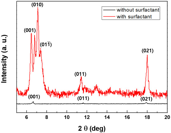 To confirm the relationship between the crystallinity and PL efficiency of Alq3, X-ray diffraction data were obtained for the samples prepared, with or without SDS as a surfactant. Figure 5 displays the XRD patterns for the two types of Alq3. The XRD peaks indicate the degree of crystallinity according to Bragg’s law. The peak corresponding to the (001) crystal lattice plane was observed at 6.47° for crystalline Alq3. Peaks were also observed at 11.55° and 17.45° for both cases, respectively, corresponding to the (011) and (021) planes. However, other major peaks at 7.1°, 7.38°—related to the (010) and (011) planes respectively—were only observed for the crystalline structure. We can also identify the crystal phase of Alq3 using XRD data. In Figure 5, the XRD pattern of Alq3 MRs showed 6.47°, 7.1° and 11.55° as related to typical α-phase peaks, in addition to δ-phase peaks at 6.78° and 7.38° [23,24]. The XRD results indicate that strong π-π interactions are operative along the b-axis (b = 6.47 Å) of the Alq3 molecules in the hexagonal column of Alq3 MWs, which contributes to the very bright emission [25,26]. However, relatively weak XRD peaks were observed for the Alq3 NPs, which have the same molar concentration as Alq3 MWs—as shown in Figure 5—indicating the poor crystalline structure of the Alq3 NPs. This led to a weak and broad PL spectrum for the Alq3 NPs. The Alq3 crystals prepared with SDS grew preferentially in a specific direction and were more crystalline than the congener prepared without SDS, based on the data shown in Figure 5.