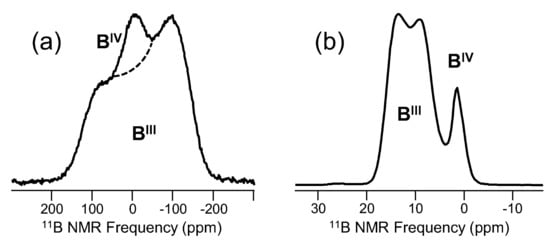 - Silver, A.H.; Bray, P.J. Nuclear Magnetic Resonance Absorption in Glass. I. Nuclear Quadrupole Effects in Boron Oxide, Soda-Boric Oxide, and Borosilicate Glasses. J. Chem. Phys. 1958, 29, 984–990. [Google Scholar] [CrossRef]