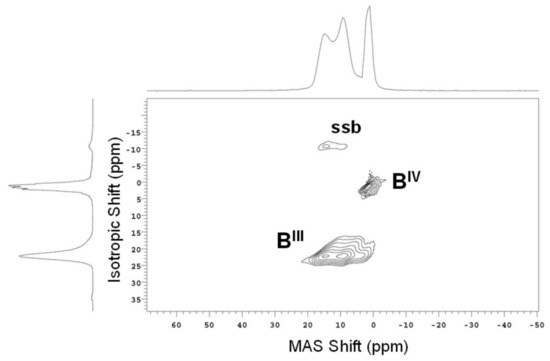 In the last 20–25 years, other methods have been developed that further narrow the NMR linewidth of quadrupolar nuclei like 11B, including double rotation (DOR) [17], dynamic angle spinning (DAS) [18] and multiple quantum magic angle spinning (MQMAS) [19], providing a way to further resolve and characterize different boron polyhedra in glasses. MAS and MQMAS NMR of 11B are now commonly used to identity these groups and to accurately follow their compositional, temperature- and pressure-dependent concentrations. An example of 11B MQMAS NMR data from an alkali borate glass is given in Figure 3 [20]. These data, which typically take a few hours to collect, provide complete resolution of BIII and BIV sites, but also purely isotropic spectra for BIII sites, which are broadened by second-order quadrupolar effects under MAS NMR conditions. This allows for better identification of different BIII environments, which in boron-rich glasses typically include symmetric BIII units in superstructural units (i.e., well-defined rings) and those BIII without such geometric constraints (i.e., non-ring boron). 11B 3QMAS NMR data can also aid in identifying BIII with different numbers of bridging and non-bridging oxygen (NBO), which are often observed in borate glasses with large amounts of modifier. Since boron is indeed a critical element in borosilicate and other commercially-important glasses, 11B NMR has remained one of the more common means by which to study glass structure using NMR spectroscopy.