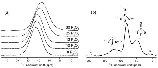 31P MAS NMR spectra for (a) a series of binary P2O5-SiO2 glasses [29], with permission from Cambridge University Press. P2O5 content in mol % is shown to the right of each trace. In (b) is 31P MAS NMR data for a ternary sulfide glass with composition 10P2S5-6.7Ga2S3-83.3GeS2, adapted from [37] with permission from Elsevier. Different P polyhedra and their associated 31P NMR resonances are labeled in (b), and asterisks denote spinning sidebands.