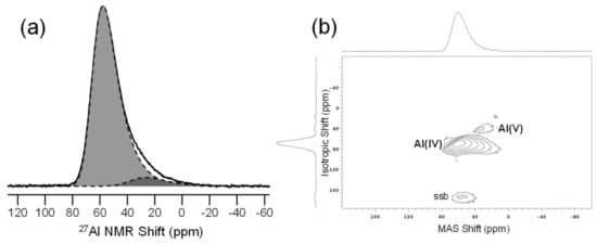- Neuville, D.R.; Cormier, L.; Montouillout, V.; Massiot, D. Local Al site distribution in aluminosilicate glasses by 27Al MQMAS NMR. J. Non-Cryst. Solids 2007, 353, 180–184. [Google Scholar] [CrossRef]
