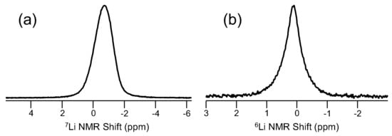 Other commonly-studied elements in Figure 1 having application in glass science include lithium and sodium, two important modifiers in glass, as well as fluorine, which next to oxygen is one of the most commonly-found anions in inorganic glasses. Lithium NMR, using 7Li (spin-3/2; 92.58%), was demonstrated in glass science again by Bray, showing in the early 1970s the ability to study ionic motion in glasses [45]. Müller-Warmuth also demonstrated early the importance of 7Li NMR in glasses [46]. More recently, 7Li and 6Li (spin-1; 7.42%), both of which exhibit favorable NMR properties, have been used to address a variety of topics, including ionic motion, short-range structure and elemental partitioning in glass-ceramic systems. 7Li generally exhibits a broader signal due to larger quadrupole moment, but is more abundant and has a higher resonance frequency. 6Li is essentially like a spin-1/2 nucleus as a result of a very small nuclear quadrupole moment and has been shown to give higher resolution (e.g., narrower peaks) and thus sometimes used to examine lithium environments in glasses [47]. One example for both 6Li and 7Li MAS NMR for a lithium aluminosilicate glass, as drawn in Figure 7, exemplifies the type of NMR spectra achievable for these modifier cations. The 7Li MAS NMR spectrum contains a single resonance, which is slightly asymmetric as a result of some residual second-order quadrupolar broadening. The 6Li MAS NMR data (Figure 7b) are typically more symmetric and narrower, which in principle allows for enhanced spectral resolution and the ability to discriminate between different Li+ sites, though the experimental trade-offs are reduced sensitivity, due to lower natural abundance, and much longer T1 relaxation. For example, these Li NMR spectra were collected at 16.4 T using a 3.2-mm MAS NMR probe, but the 6Li MAS NMR spectrum required short pulse widths (π/6) and 600-s recycle delays to allow for relaxation, while 7Li MAS NMR data were collected much faster (π/6, but only 10-s recycle delay). On top of this drastic difference in spin relaxation, the natural abundance of the two Li isotopes makes 6Li MAS NMR even more time consuming, usually requiring hours to collect an adequate signal. Another feature of the spectrum in Figure 7b is the Lorentzian line shape, reflecting Li ion mobility in this room temperature measurement, which is also why 6Li and 7Li NMR have found significant use in the study of Li-conducting glasses [48]. In addition, 6Li NMR studies have been particularly useful in following lithium partitioning in glass-ceramics [49].