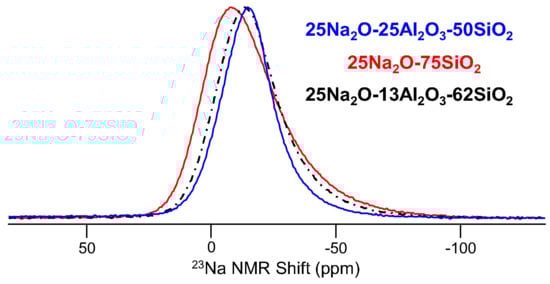 Sodium (23Na (spin-3/2; 100%)) is interesting in that the signal is easy to measure, the quadrupolar coupling is modest and NMR of 23Na can further benefit from high-resolution techniques like MQMAS. However, in glasses, sodium has a rather poorly-defined coordination environment. We generally consider sodium to have an average coordination number between five and six, or even higher in glass melts, which has been well studied using 23Na NMR [50,51], but the 23Na NMR spectrum of a glass reflects only the average environment, which while very important in glass science, does not yield the resolution of different structural or chemical environments. The 23Na MAS NMR spectra in Figure 8 show how line shape and frequency change with glass composition, reflecting the role of Na+ as either a modifier (i.e., forms NBO) or a charge-balancer for negatively-charged AlO4− polyhedra; however, even in a glass containing both sodium environments, for example the peralkaline 25Na2O-13Al2O3-62SiO2 glass in Figure 8, only one peak is detected, and it appears intermediate to the peaks due to Na+ in either a charge-balancing or network modifier role. MQMAS NMR of these same glasses does not yield improved resolution in the sense of identifying multiple peaks and thus multiple sodium sites, but are still invaluable in characterizing isotropic chemical shift and quadrupolar coupling constants for the average sodium environment, both of which can be correlated with coordination number and average sodium-oxygen distance [52]. The latter has been exploited in studying the impact of pressure on the structure of sodium-modified glasses [12,53]. 23Na MAS NMR data like those in Figure 8 are collected using π/12 pulse widths, 1- or 2-s recycle delays and the acquisition of several hundred scans, depending on the Na content of the glass. These particular data were measured at 11.7 T with a 3.2-mm MAS NMR probe (20-kHz sample spinning), and each spectrum required approximately 30 min of experimental time.