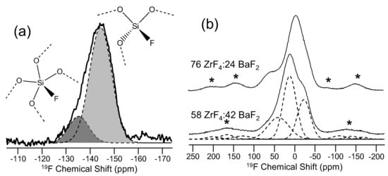 19F NMR data for (a) F-doped silica [56], with permission from Elsevier, and (b) two binary barium fluorozirconate glasses, adapted with permission of Elsevier from [58]. In (a), the assignment of the two resonances is depicted in the structure diagrams, where all oxygen atoms are bridging to other silicon atoms (not shown in diagram). Glass compositions and spinning sidebands (asterisks) are shown for (b). In both figures, solid lines denote experimental 19F MAS NMR data, and filled curves or dashed lines represent fitting of the data using Gaussian lineshapes.