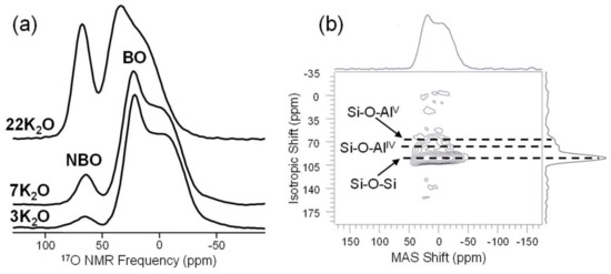 Examples of 17O NMR in glass science. The series of MAS NMR spectra in (a) show the evolution of non-bridging oxygen (NBO) concentration as a function of K2O in binary potassium silicate glasses, adapted with permission by Elsevier from [26]. The 17O 3QMAS NMR spectrum of (b), measured for a 10 wt % Al2O3 in silica glass, provides the resolution of multiple bridging oxygen sites, which differ due to the nature of their connected network-forming polyhedra, as shown by the dashed lines and labels. Adapted with permission from [80]. Copyright 2004, American Chemical Society.