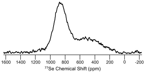 77Se MAS NMR spectrum of a binary germanium selenide glass (Ge10Se90), with two distinct resonances assigned to Se bridging two Se atoms (left) and Se bridging one Se and one Ge atom (right) [85]. This room temperature spectrum was obtained at 4.7 T, using a 4-mm MAS NMR probe with modest sample spinning (10 kHz) and a recycle delay of 60 s, accounting for the lengthy 77Se spin-lattice relaxation time.