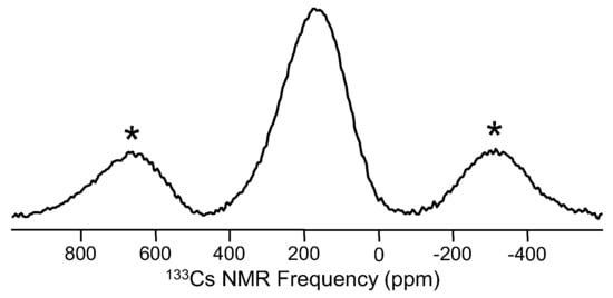 133Cs MAS NMR spectrum of a glass having a composition of 25Cs2O-37.5Al2O3-37.5Ga2O3 [87]. Spinning sidebands are marked by asterisks. Data were collected at 11.7 T using a 2.5-mm MAS NMR probe (sample volume = 11 μL; spinning rate = 30 kHz), with a total acquisition time of 1–2 h.