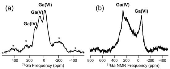 71Ga MAS NMR spectra for (a) a ternary sodium gallium tellurite glass (10Ga:10Na:80Te in atom %) and (b) a sulfide glass with composition 90AsPS4-10GaPS4 [89]. Labels represent different gallium coordination numbers, and spinning sidebands are marked by asterisks. Both spectra were collected at 11.7 T using a 2.5-mm MAS NMR probe with sample spinning of 30 kHz. π/12 pulse widths, 0.5-s recycle delays and number of acquisitions (as high as 400,000) scaled by the Ga2O3 content of the glass resulted in total experiment times of ~12–60 h for each glass sample.