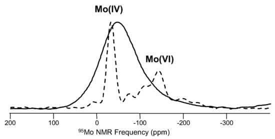 An example of 95Mo MAS NMR from a mixed-alkali molybdate glass (33.3R2O·66.7MoO3), compared with data from polycrystalline Na2Mo2O7 (dashed line) [93]. Comparisons with NMR data from known crystalline compounds are beneficial for understanding data from glasses. 95Mo NMR peaks from tetrahedral and octahedral Mo are shown for Na2Mo2O7, and baseline “ripples” for these data are from truncation of the time-domain signal from incomplete acquisition of the full spin echo.