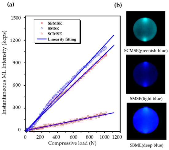 ML intensity-load relationship (a) and optical ML images (b) of SrAMgSiO:Eu for A = Ca, Sr and Ba, noted as SCMSE, SMSE and SBMSE, respectively. Reproduced from Ref [11] Copyright (2009) The Japan Society of Applied Physics.