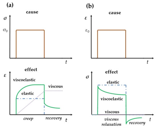 where the second term corresponds to viscous stress which is here associated with local rotation [54]. Typical phenomena of viscoelasticity are stress relaxation (a step constant strain results in decreasing stress), creep (a step constant stress results in increasing strain), and hysteresis (a phase lag in stress-strain relation). The response to stress (strain) of elastic, viscous and viscoelastic materials are drawn schematically in Figure 2, for the purpose of comparison.