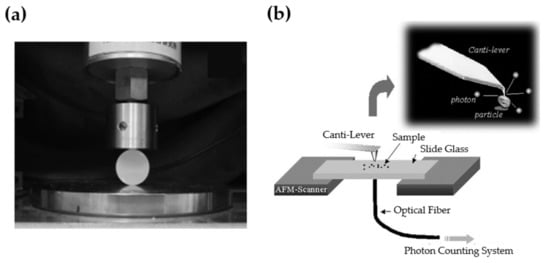 A setup capable of deforming materials can be utilized to measure ML, combined with additional devices to collect the emission of light. A typical apparatus introduced by Xu et al. is shown in Figure 3a [57], where the force (or displacement) can be read from load actuators and the instantaneous ML intensity can be recorded by photomultiplier tubes (PMT), photodiodes, high speed cameras or portable spectrometers. It is also possible to detect ML at the micro-scale (Figure 3b) by attaching a photo-counting system to an atomic force microscope [58]. This method is helpful to gain insights into the relationship between the strain and ML intensity, although the signal is inevitably quite weak. Standardized measurement procedures are needed to compare ML results from different phosphors or setups, for example using calibrated detectors that quantify absolute ML energy [59].