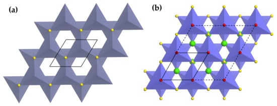 Tridymite (Figure 5a), a high temperature polymorph of silica, is an excellent example to illustrate the bonding topology of framework structures, which are typical for silicates and aluminates. Vertex sharing [SiO] tetrahedra are often connected to form ring-like nets in planes, such that framework structures are formed when the third dimension is subject to further connections. The topology of ring-like structures is characterized by the sequence of upward (U) or downward (D) pointing of tetrahedra, e.g., UDUDUD for tridymite (Figure 5a). It is also possible to replace Si ions by ions of lower oxidation states, on condition that charge neutrality is achieved by suitable cations. These cations are stuffed in cavities, resulting in stuffed tridymite structures. Accordingly, different topologies of tetrahedron arrangements or/and structural distortions lead to a large number of supercells and structures of low symmetry [208].