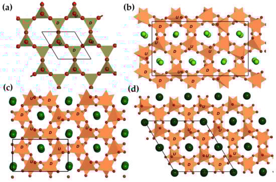 Structure of tridymite (a) along [001], crystal structure of CaAlO unit cell (b) along [010], crystal structure of SrAlO supercell () (c) along [100], and crystal structure of BaAlO supercell () (d) along [001]. Unit cells are outlined by black lines, and the direction of tetrahedra was marked as U(up) and D (down). (Ca: green, Sr: deep green, Ba: heavy green, O: red.)