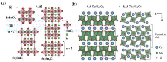 Crystal structure of Ruddlesden-Popper structures SrSnO (a) viewed along [010], where (i) n = ∞, (ii) n = 1, and (iii) n = 2; crystal structure of calcium niobates mCaO·NbO (b) for (i) m = 1, and (ii) m = 2. Reproduced from Refs [29,183] with the permission of AIP Publishing and Copyright (2016) American Chemical Society, respectively.
