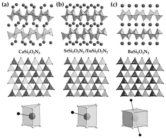 The crystal structure (top), silicate layers along [100] (middle) and cation coordination (bottom) in CaSiON (a); SrSiON (b); and BaSiON (c). Tetrahedra with vertices up and down are depicted in dark gray, and in light respectively (N: black, O: light gray). Reproduced from Ref [241], Copyright (2009), with permission from Elsevier.