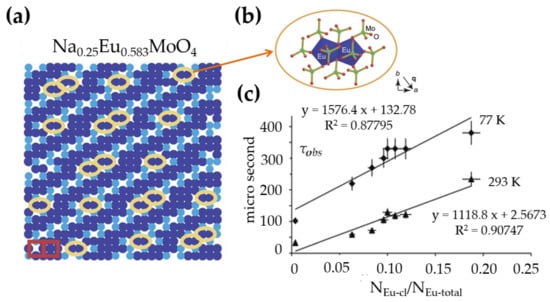 Part of the cation subset along [001] (a), the nearest neighbors of the Eu dimer (b) in NaEuOMoO, and (c) the lifetime of levels as a function of relative amount of Eu clusters at 77 K and 293 K. (In (a), Eu: dark, Na: light blue, vacancies: white, Eu-Eu: yellow, different cation distribution in adjacent cells: red box.) Reproduced from Ref [283] with permission of The Royal Society of Chemistry.