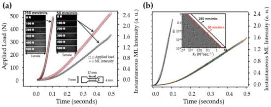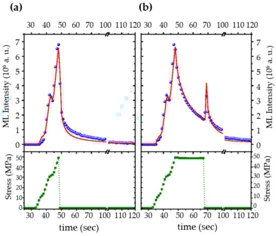 Triboluminescence was historically used as a synonym for ML [2], but nowadays it refers to luminescence due to the contact of two dissimilar materials [3]. The process often involves a triboelectric field, a chemical reaction or just the generation of heat in the contact area. In a narrower sense, ML refers to luminescence induced by elastic deformation (elasticoluminescence), plastic deformation (plasticoluminescence), or fracture (fractoluminescence) depending on the magnitude of stress. Fractoluminescence was reported in as many as a thousand compounds and can be found in of inorganic, and even of all crystalline materials, according to an estimate in the late 1990s [4]. It is mainly attributed to the breaking of chemical bonds, which charges ambient nitrogen gas or/and luminescent dopants [5,6,7], and has found applications in sensors for damage monitoring [8]. The study of its mechanism is complicated by the difficulty in assessing the influence of crystal size, the mechanical load and the surrounding gasses, etc.