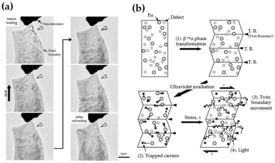 Only limited research has been reported on ML at the microscale [58,149], but the influence of microstructure can be vital in several cases. Twin structures with various morphologies were found in SrAlO:Eu phosphors and the domains show quasi-elastic character under nano-indentation (refer to Section 4.2 for their roles in ML mechanism). The mechanically assisted release of carriers from sites near boundaries was argued to induce ML in this compound [30]. Microstructures in ML phosphors clearly deserve more attention and deeper investigation.