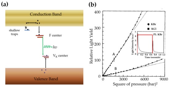 - Metz, F.I.; Schweiger, R.N.; Leidler, H.R.; Girifalco, L.A. Stress activated luminescence in X-irradiated alkali halide crystals. J. Phys. Chem. 1957, 61, 86–89. [Google Scholar] [CrossRef]