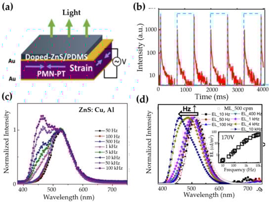 - Gan, J.; Kang, M.G.; Meeker, M.A.; Khodaparast, G.A.; Bodnar, R.J.; Mahaney, J.E.; Maurya, D.; Priya, S. Enhanced piezoluminescence in non-stoichiometric ZnS:Cu microparticle based light emitting elastomers. J. Mater. Chem. C 2017, 5, 5387–5394. [Google Scholar] [CrossRef]