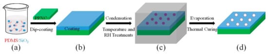 Fabrication procedures of Polydimethylsiloxane (PDMS)/SiO2 coating on Poly(chloro-p-xylylene) (PPXC) film controlled by different temperatures and relative humidity (RH) treatment conditions. (a) Fabrication of PDMS/SiO2 suspension; (b) Dip coating of PDMS/SiO2 on PPXC film; (c) Water droplet condensation on PPXC film in controlled temperature and RH conditions; (d) Thermal curing of PDMS/SiO2 coating on PPXC film and evaporation of water droplets.