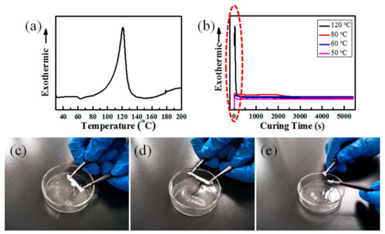 (a) Non-isothermal from 30 to 200 °C; (b) Isothermal DSC curves for 90 min at different temperatures of PDMS; (c–e) Screenshots of PDMS during stretching after different curing temperatures at 80, 60, and 50 °C for 90 min under 55% RH.