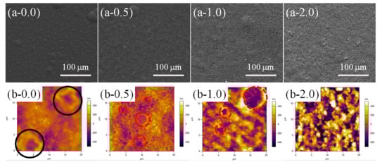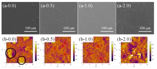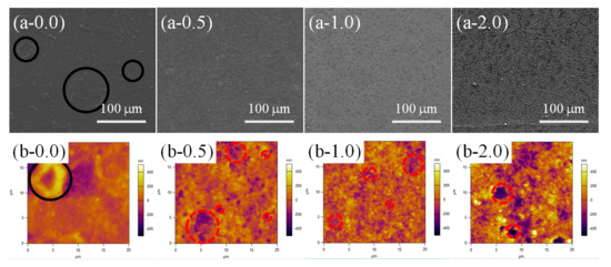 As mentioned above, lower temperature increased the time required for the cross-linking reaction of PDMS. In this section, we further investigated the surface morphology evaluation of the samples with different contents of SiO2 (0.0, 0.5, 1.0 and 2.0 wt %) at a lower curing temperature (60 °C for 90 min under 55% RH, Figure 6). A large number of RBS with homogeneous distribution could be found on the whole PPXC film with pure PDMS (Figure 6(a-0.0)), showing a similar distribution to that in Figure 5(a-0.0). However, the number of RBS was much greater and the dimension of RBS became smaller with the length of only about 5 μm after the treatment at 60 °C (Figure 6(b-0.0), black circles) compared to that obtained after the treatment at 80 °C (Figure 5(b-0.0)). After the low content (0.5 and 1.0 wt %) of SiO2 nanoparticles were added in PDMS coating, RBS disappeared, and TPS appeared (Figure 6(a-0.5) and (a-1.0)), showing the same morphology as that obtained after the treatment at 80 °C (Figure 5(a-0.5) and (a-1.0)).