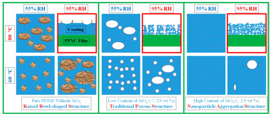 To clearly reveal the mechanism of surface morphology evolution, the effects of cross-linking reaction temperature (upper row for 80 °C and lower row for 60 °C), RH (left column for 55% RH and right column for 95% RH), and content of SiO2 (left column for pure PDMS without SiO2, middle column for PDMS with a low content of SiO2, and right column for PDMS with a high content of SiO2) are shown in Figure 8. Based on the results in Figure 5, Figure 6 and Figure 7, the conclusions can be drawn below.