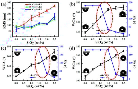 (a) Statistic surface roughness (RMS) on the samples with different contents of SiO2 under different RH treatment conditions (80 °C-55% RH treatment (red square), at 60 °C-55% RH treatment (green circle), and at 60 °C-95% RH treatment (blue triangular)); WCA and SA on the samples with different contents of SiO2 under different RH treatment conditions (80 °C-55% RH treatment (b); 60 °C-55% RH treatment (c); at 60 °C-95% RH treatment (d)). Profiles in the lower left and upper right in Figure 9b–d show the behaviors of static water droplets on the surface. Profiles in the upper left indicate that the water droplets cannot slide off the surface even after 180° reversal of the surface, but profiles in the lower right indicate that the water droplets easily slide off the surface within 10° SA. Water droplets still cannot slide off the surface with a “Wenzel” state shown in the red dash circles.