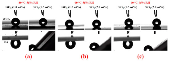 Profiles of water droplets for WCA (upper row) and SA (lower row) on different samples after being left in room conditions for about 6 months with different contents (left and right columns) of SiO2 at 80 °C-55% RH (a); 60 °C-55% RH (b); and 60 °C-95% RH (c).