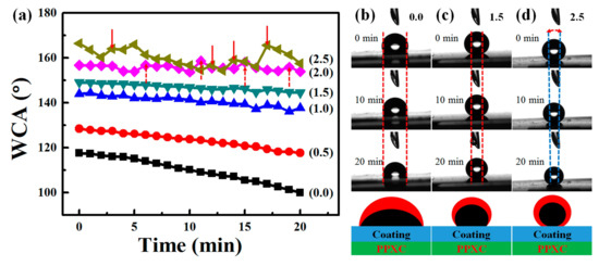 The evolution of WCA with time after deposition of the water droplets on samples with different contents of SiO2 at 60 °C-55% RH (a); the profiles of water droplets on sample with 0.0 wt % (b); 1.5 wt % (c); and 2.5 wt % SiO2 (d); with 0 min, 10 min, and 20 min. The schemes in Figure 12b–d show the evolution of water droplets before (red) and after (black) evaporation. The red and blue dash lines in Figure 12b–d showed the edges of the three-phase contact lines during the evaporation of water droplets. The gradually decreased length of the three-phase contact line in Figure 12d was illustrated by the red dash arc double arrows and the scheme.