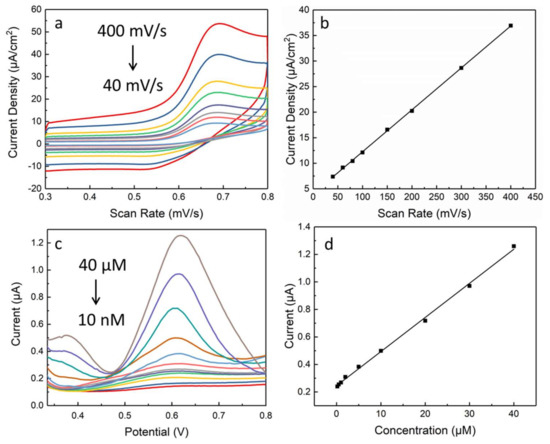 The mechanism of AuNP-decorated graphene electrodes for vanillin detection was investigated by changing the scan rate of CV measurement. As shown in Figure 3a, the peak current increases, and oxidation peak potential shifts to the positive direction as scan rate increases from 40 to 400 mV/s. The current density of oxidation peak as a function of the scan rate is shown in Figure 3b, which shows a good linear relationship with the correlation coefficient value of 0.999, indicating that the oxidation of vanillin on the proposed electrodes is a typical adsorption-controlled process [22]. The electrochemical method of differential pulse voltammetry (DPV) was applied to determine the low detection limit of vanillin. A typical DPV response carried out in PBS buffer (pH = 7) for different concentrations of vanillin (from 10 nM to 40 µM) can be seen in Figure 3c. It is obvious that the peak current of vanillin with the potential around 0.6 V increases as the concentration of vanillin rises from 10 nM to 40 µM. As shown in Figure 3d, the peak current shows a linear relation as a function of vanillin concentration, with the equation expressed as and the correlation coefficient as 0.999 (from 0.2 µM to 40 µM). This good linear relationship confirmed that the sample after 4 min of electrodeposition of AuNPs can be successfully used for the detection of vanillin. The low limit of detection was demonstrated at about 10 nM in this work, showing higher sensitivity and a lower detection limit compared to reported works [13,21]. Our findings prove that the formation of AuNP/high-quality graphene hybrids enables higher electrochemical sensitivity than does that of electrodes prepared by drop casting rGO.