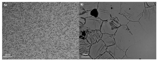 Microstructure of the studied titanium alloys. (A) Ti6Al4V ELI; (B) Ti35Nb10Ta1.5Fe.