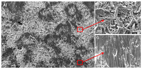 The Ti6Al4V ELI acid-etched surface had a heterogeneous surface topography with peaks and valleys of varied geometries, and the distance from peak to peak was around 1–3 µm. The differences in surface topography can be attributed to the non-equiaxed grains and phase distribution found on the studied alloy. Micropits were overlapped a macrorough textured area produced by the grooves from the machining process (Figure 3A).