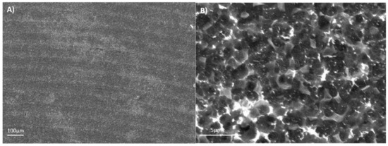 The SEM images for the acid-etched Ti6Al4V ELI: (A) 100×; (B) 1500×.