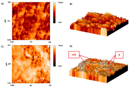 A bigger difference in the mean roughness values was observed in the α + β phase compared with the ground sample and the β phase of the acid-etched Ti35Nb10Ta1.5Fe samples. This phenomenon was also observed in the 2D and 3D profiles, obtained by employing the FRT Mark III® software, where the more etched areas were plotted in dark red in Figure 5C and with deeper cavities in Figure 5D.