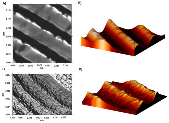 The surface roughness of the Ti6Al4V ELI alloy shown by confocal microscopy. (A) The 2D topographic roughness grid sample; (B) The 3D topographic roughness grid sample; (C) The 2D topographic roughness acid-etched sample; (D) The 3D topographic roughness acid-etched sample.