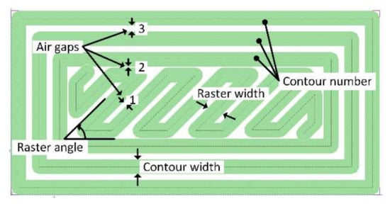 - Contour width: this is the width of the material bead used for contours. This parameter was not included in the previous studies reported in the introduction section. This could be due to the assumption that the road width for raster and contour can have a similar effect on the properties of the materials.