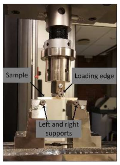 For the current experimental investigation, the INSTRON 5985 universal testing machine with a load cell of 250 kN was used. The experiment was conducted by adopting ISO 178 standard [], based on recommendations from the standard organizations, International Standards Organization (ISO) [] and National Institute of Standards and Technology (NIST) [], since no specific standard has been developed for the testing of parts produced by the FDM technique. The flexural test was carried out by placing the specimen on two supports from the bottom and applying the load from above with the loading edge of radius 5 mm, as shown in the experimental setup in Figure 3. A recommended speed of 2 mm/min was used for the test as per the standard. A 10 N preload was applied before the test started to ensure good contact between the specimen and the supports. Once the load reached the maximum, for the samples that break, the test was stopped. However, for the samples that did not break at the maximum load, 5% strain was used as the stopping criterion, as per the recommendation in the standard.