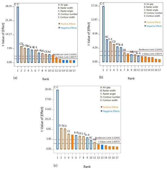 Factor screening using Pareto charts for (a) flexural strength; (b) modulus and (c) strain.