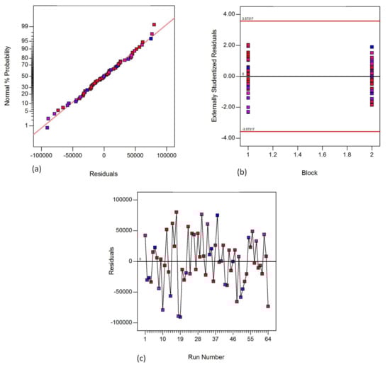 Figure 5, Figure 6 and Figure 7 show the fisher assumptions test for the models developed. The linear patterns in Figure 5a, Figure 6a and Figure 7a show the linearity of the residuals in both replicates for all the responses, flexural strength, flexural modulus and flexural strain. The linearity of the patterns in the plots are evident for the good-fitting of the predicted values to the experimental (actual) values. The plots in Figure 5b, Figure 6b and Figure 7b show the equality of variance for both replicates (Block 1 and Block 2). These plots demonstrate that the runs in Block 1 and in Block 2 have a similar variation of residuals. Figure 5c, Figure 6c and Figure 7c demonstrate the run-order independence of the runs. These plots show patterns that show that the residuals in the model are randomly distributed.