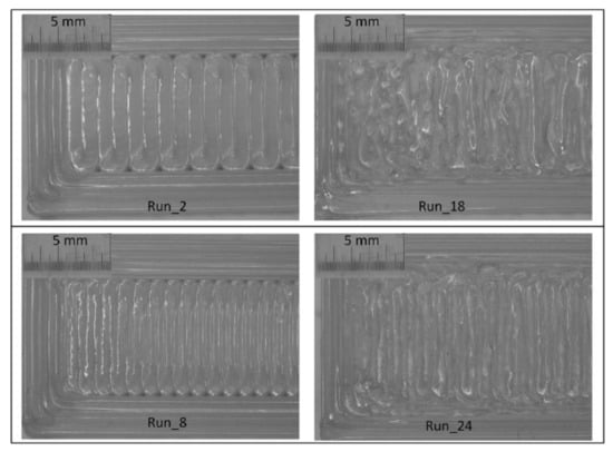 The effect of the air gap on the flexural property of the material is not great, compared to the other parameters, as shown in Figure 8a–c. However, it makes its own contribution to the variation of the flexural properties of the material, as shown in Figure 9, which illustrates the maximum flexural strength variations of all the runs. Among the runs, one to 16 are produced with zero air gap (0 mm), while the rest are produced with a negative air gap (−0.0254 mm). It is very clear from Figure 9 that, when all the counter runs (i.e., low and high air gaps) such as run_1 and run_17, run_2 and run_18, and so on are compared, the negative air gap has improved the flexural strength of the material. This could be due to the dense structure obtained by slightly overlapping deposition of the filaments, thus avoiding the gap between the filaments. The negative air gap also strengthens the adhesion between the adjacent filaments so that the flexural properties of the material are improved. However, the negative air gap also has drawbacks in reducing the dimensional accuracy and the surface quality of the part, as shown in Figure 10, which displays the comparison of a few representative counter parts, run_2 and run_18, and run_8 and run_24, with positive and negative air gaps, respectively, while the other parameters are unchanged. From the figure, it is clear that the surface quality of those parts with a negative air gap is very poor, compared to their counterparts with a positive air gap that resulted from the overlapping of the filaments and excess material buildup.
