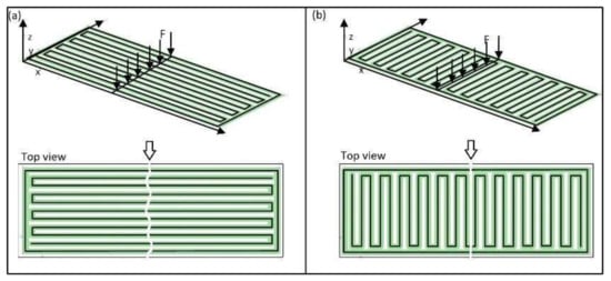 Parts manufactured with raster angle (a) low (0°) and (b) high (90°) with their loading conditions and failure modes as top view.