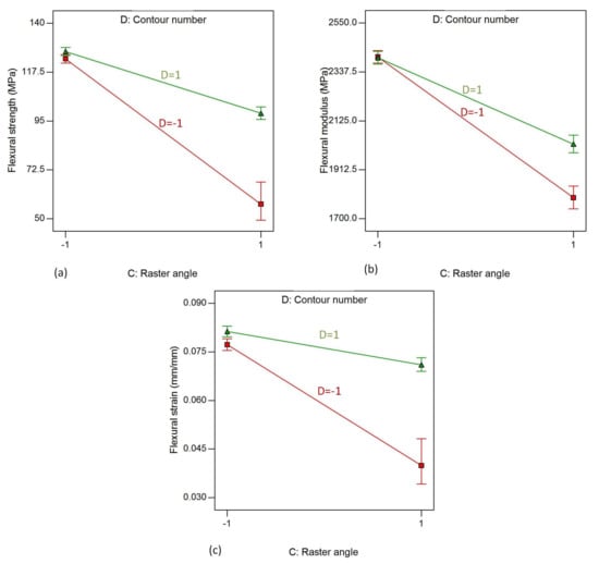 The interaction effects of raster angle and contour width on the responses, flexural strength, flexural modulus and flexural strain, while the other factors are kept constant at their high level, are shown in Figure 17a–c, respectively. From the figure, it is evident that flexural strength, flexural modulus and flexural strain tend to decrease when the raster angle increases from 0° to 90° for both level of contour number. The plots of flexural strength and flexural strain exhibit similar trends. The effect of raster angle is much higher when the contour number is at a low level than when it is at its high level. This is due to the fact that the high contour number improves the flexural properties of parts by resisting the applied load more than those parts with a single contour. The flexural modulus decreases drastically when the raster angle increases from 0° to 90° for parts with a single contour, compared to the parts with five contours, as shown in the middle plot of Figure 17.