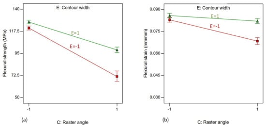 The interaction effects of C (raster angle) and E (contour width) on responses, flexural strength and flexural strain are shown in Figure 18. The other factors are kept at their high level, as previously. The interaction effect has similar trends with the CD effects, as contour number and contour width show a similar effect on both flexural strength and flexural strain.