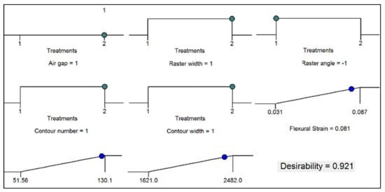 The FDM process is an additive manufacturing process with many factors that have conflicting advantages for the performance of the produced parts. Hence, it is important to optimize these factors to maximize the flexural properties of the parts. The desirability function is used in this study to determine the optimum process parameters that simultaneously maximize multiple responses. In the numerical optimization process [], the desired goal for each of the factors and responses is chosen; weights are assigned to each goal, if necessary, to adjust how the optimization process searches for the best solution and, if any of the goals has a different level of importance, it is adjusted by assigning it a relative value. For the current study, the desired goals of the factors are set to be in the range between the lower and higher limits except for the air gap, which is set to the higher limit since the lower limit has drawbacks as discussed in Section 4.1. These desired goals are detailed in Table 4. The goals for the responses are set to maximize them. The weights and importance levels of all the goals are set to be identical, as they are all equally important.