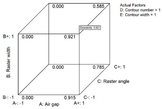 The plots in Figure 20 illustrate the result of numerical optimization. The figure shows the optimal level of parameter combination that result in an optimal response. The optimal levels of parameters obtained are high-level air gap (0.000 mm), high-level raster width (0.7814 mm), low-level raster angle (0°), high-level contour number (five) and high-level contour width (0.7814 mm). The predicted optimal responses registered for this combination of parameters are 126.996 MPa flexural strength, 2399.803 MPa flexural modulus and 0.081 flexural strain, with desirability of 0.921, as shown in the 3D-cube plot in Figure 21. These predicted optimal responses are moderately in agreement with the experimental result for this combination of parameters.
